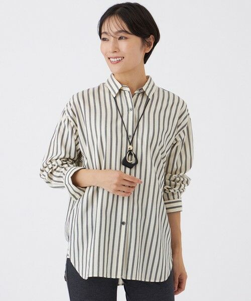 【カタログ掲載】【ウォッシャブル】ジャカードラメストライプシャツさりげなく輝くラメのラインがポイントのストライプシャツです。定番のシルエットで合わせやすく、さらっと着るだけでお洒落に決まる便利なアイテムです。1枚でも羽織でも、重ね着のインナーとしても活躍します。【素材】ベーシックなストライプ生地にさり気ないラメ糸を織り込み、上品な印象に仕上げました。さらりとした肌触りで快適な着心地が特徴です。(秋冬展開商材)