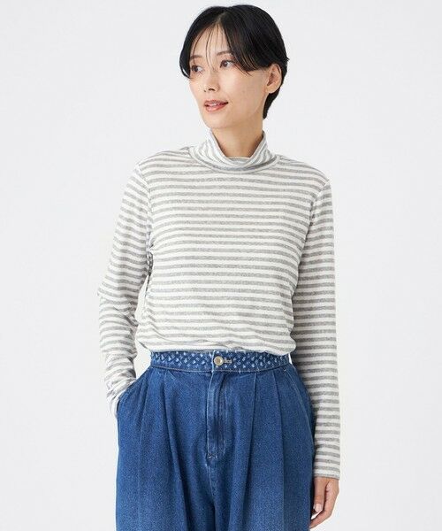 程よいネックの高さが着やすく、寒いシーズンも防寒インナーとして着用いただけます。薄手の肉感なのでインナーとしてはもちろん、身幅に少しゆとりを持たせたなだらかなAラインシルエットなので、一枚でも着用いただけます。インナー使いしやすい細ボーダーと淡い色の配色ボーダーは少し太めの展開で、色の雰囲気でボーダーピッチを変えました。