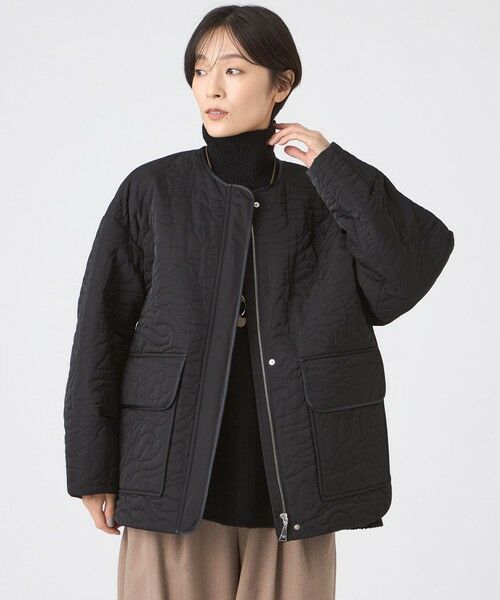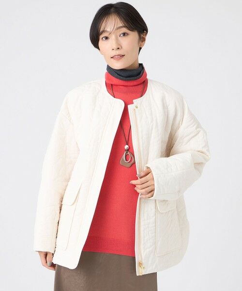 衿ぐりや前立て、ポケットをサテンでパイピングすることで、マットなキルトの中に、光沢のラインがポイントになったショートキルトジャケット。バレル型の袖と、テールカットの裾が全体的に丸みと動きを加えたデザインになっています。羽織るだけでトレンド感が出る一押しのアウターです。