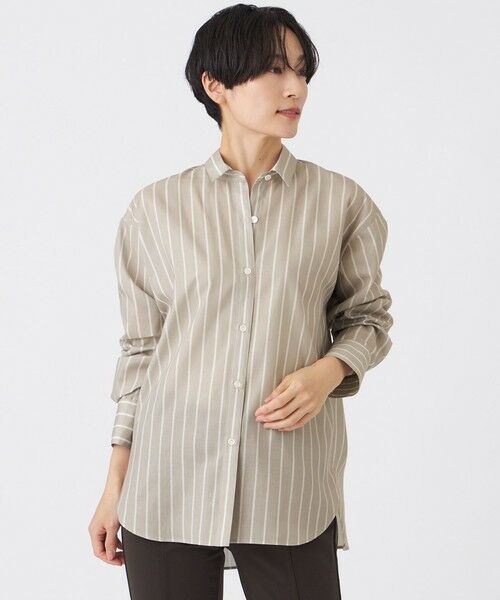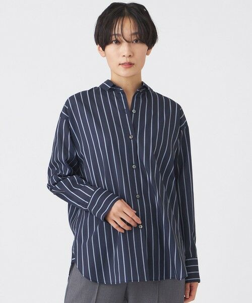 【マシンウォッシャブル】コットンライクストライプシャツ汎用性が高く、シャープな着こなしに欠かせない定番のベーシックシャツ。無地ライクに使える細めのピンストライプ柄をプリントしました。ニットベストとの重ね着がおすすめです。【素材】コットンライクなポリエステルスパンのシャツ素材です。天然素材のような見え方でありながらも、ポリエステル100%で扱いやすい素材です。程よいハリのある、軽い素材なので重ね着にも便利です。(秋冬展開商材)