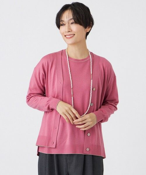 脇のラメラインが、視覚的にボディラインをすっきりと見せてくれるニットカーディガン。袖口や裾口の編み出しにもラメをライン状に施し、派手すぎず、大人の女性にぴったりの繊細な輝きに仕上げました。ゆったりとした身幅でありながらも、短めの着丈でバランスが取りやすく、シンプルなTシャツやブラウスの上に羽織るだけで、普段使いのおしゃれがワンランクアップします。カジュアルなデニムスタイルから、きれいめなパンツやスカート、ワンピースと合わせれば通勤着としても活躍する万能アイテムです。ベーシックなブラック、ライトグレーの他に、春を先取りしたシーズナルカラーのピンク系やグリーン系など、幅広いカラー展開も魅力です。