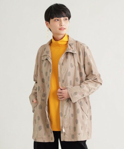 【ウォッシャブル】チータープリントタフタスタンドカラーブルゾンスッキリとしたスタンドカラーでシャープな着こなしを叶えるブルゾン。ソフトな印象のオリジナルチーター柄のプリントを使用しました。ドットのような柄感、コントラストを抑えた優しい配色が自然と馴染みます。デザインはカジュアル感のあるフラップポケットがアクセント。裾サイドのスリットベンツは動きのある軽やかな印象を添えます。上品なアニマル柄とカジュアルディテールのバランスが大人にピッタリのライトアウター。スタイリングの主役になるアイテムです。高密度のポリエステルタフタにオリジナルのチーター柄をプリントしました。軽くソフトな質感が着やすく、ご家庭でお洗濯もしていただけます。(秋冬展開商材)