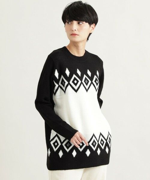 【ウォッシャブル】ウィンタージオメトリックジャカードニット冬らしいカウチン風の幾何柄を袋ジャカードで表現したニットプルオーバー。モノトーンカラーで大人っぽい印象に仕上げました。ミドルゲージでもカジュアルになりすぎず、シックな雰囲気で着こなしていただけます。スタンダードで着合わせやすいシルエットです。膨らみのある毛混糸と、ポリウレタン糸のファンシーヤーンで編み上げ、伸縮をきかせた素材です。柔らかくもっちりとした弾力のある質感が着心地よく、見た目にもウォーム感ある素材です。(秋冬展開商材)