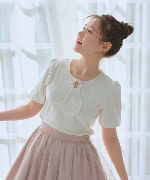 Tシャツのような気軽な着心地ながら、大人可愛い要素を詰め込んだバレエコアデザイントップス。ソフトな肌触りのフライス素材を使用し伸縮性があり快適な着心地を実現しました。胸元には自分で結ぶタイプのリボンをあしらい、繊細でフェミニンさを演出するアクセントに。さらにギャザーを寄せたパフスリーブが程よいボリュームを演出し上品な甘さをプラス。デニムやスカートと合わせて、カジュアルにもフェミニンにも着こなせる一枚です。
