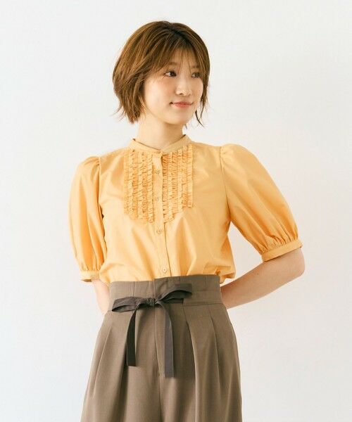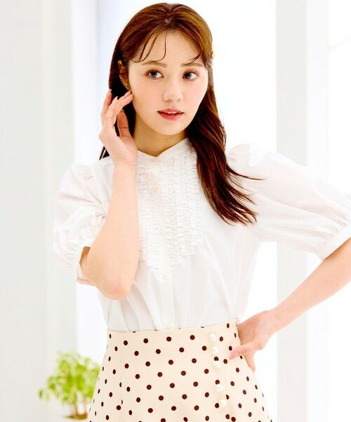 顔まわりを明るく華やかに見せるフロントフリルが特徴のブラウス。クラシカルなデザインが女性らしさを引き立てます。 袖は程よくボリュームのあるパフスリーブ仕様で、ふんわりとしたシルエットが優しい印象に。 1枚でも存在感があり、スカートやパンツと合わせて通勤コーデにも休日のお出かけにもぴったりです。