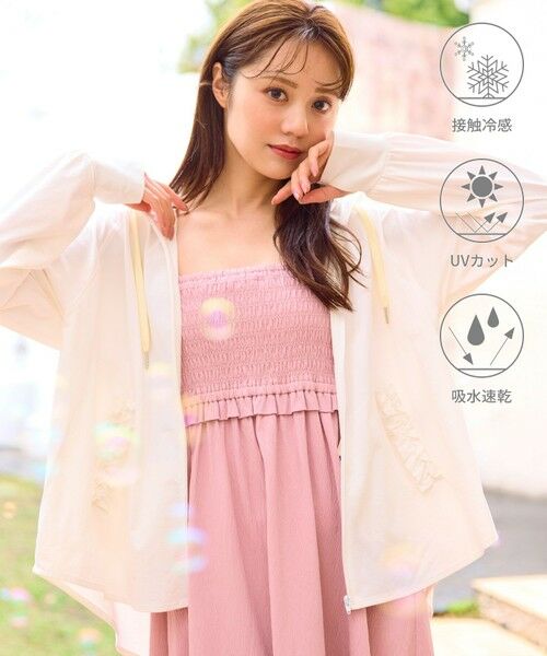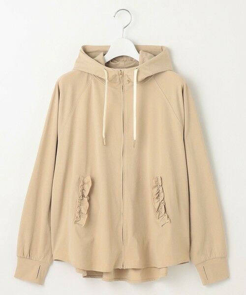 日差し除けに活躍する大きめのフードとジップを上まで閉めれば首の日焼け対策にも。フロントジップの気軽で羽織りやすいパーカーをベースにしていますが、ポケットと後ろのフリルディテールがデザインポイント。