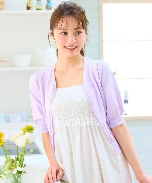 女性が気になる二の腕をカバーして華奢見えする万能カーディガン。コンパクトなサイズ感が可愛いさを際立たせます。