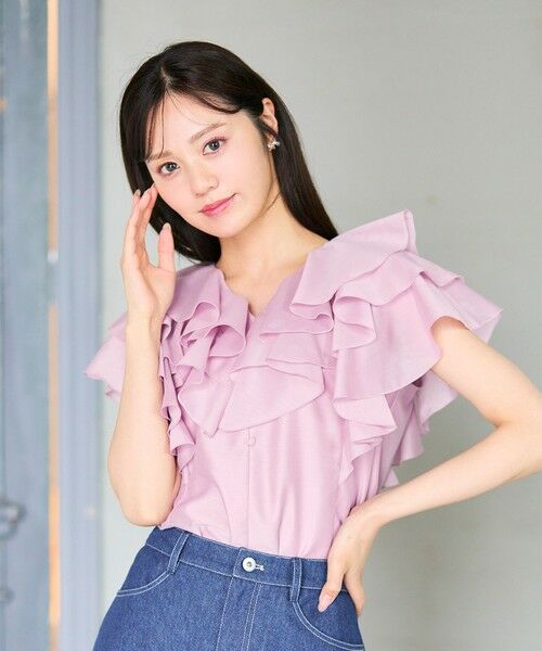 ふわふわと揺れるフリルが目を惹く、存在感たっぷりの主役級ブラウス!繊細で軽やかな素材を使用しているので、ボリュームのあるフリルも重くならず、上品で柔らかな印象に。大胆にフリルを重ねたデザインは、動くたびに揺れる表情がフェミニンなムードを引き立てます。甘さを引き締めるVネックラインで、全体のバランスも絶妙に調整。素材の美しい発色を生かしたキレイ色展開で、着るだけで気分が上がる1枚です!