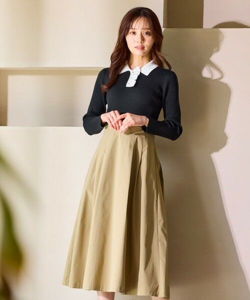 胸元のパールボタンが顔まわりを華やかに見せ、程よく艶のあるニットがきれいめな印象に。スカート部分は軽やかなタフタ素材を使用し、すっと落ちるタックラインが美シルエットを演出します。ウエストはベルト見えデザインできちんと感があり、後ろゴム仕様で着心地も快適です。バイカラーの配色がセパレート見えを叶え、通勤にもお出かけにも活躍する大人フェミニンな一着。
