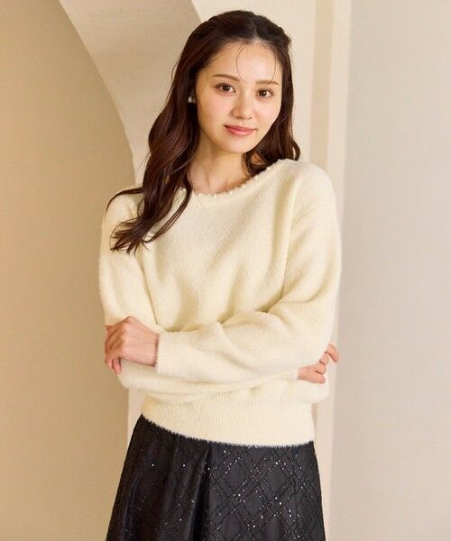 柔らかく毛足のあるシャギーニットが優しく包み込む、フェミニンムードたっぷりの1枚。ふわふわとした軽やかなタッチで着心地は驚くほどストレスフリーです。襟ぐりにあしらったパールが控えめながら上品な輝きを添え、アクセサリーいらずの華やかさを演出します。ゆるやかに開いた襟元と、ふんわりボリュームをもたせた袖が女性らしいシルエットを引き立て、