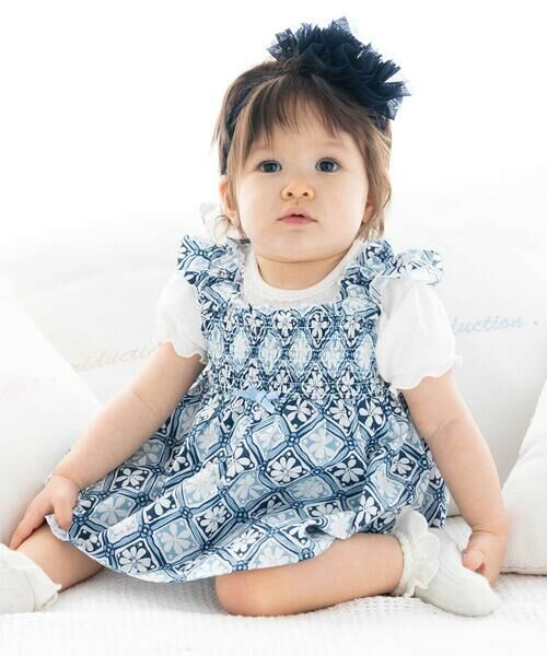 サンドレス風のシャーリングの胸元とブルーのタイル柄が涼し気です。