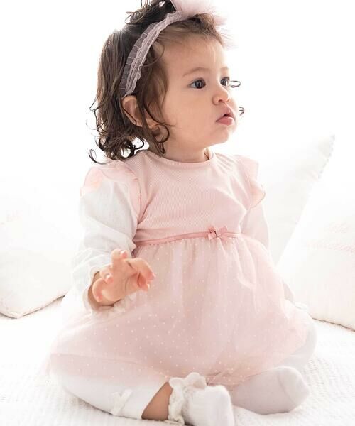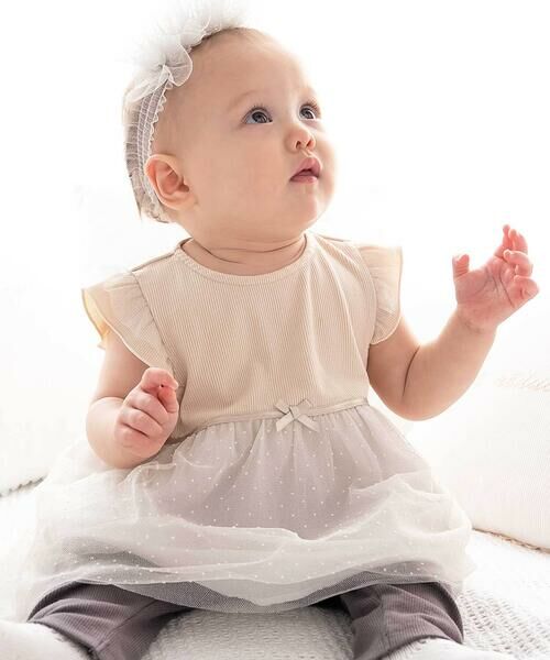 キラキラチュールのフリル袖が可愛い!異素材ミックスの女の子用ベビーチュニック。