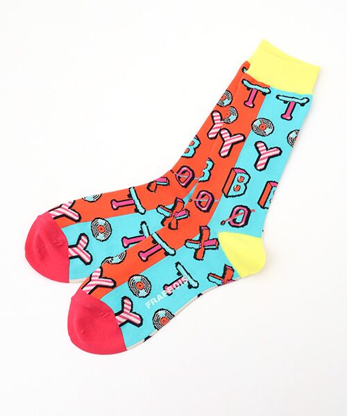 【素材】伸縮性と発色性の良い糸を使って繊細なテーマのロゴ「トイボックス」を柄で表現したソックス。【デザイン】ベース自体もカラーパネルに仕上げ、そこに繊細なテーマロゴ「TOY BOX」の柄を入れ込んだソックス。少しレトロでポップな雰囲気がスタイリングのアクセントになってくれます。*こちらの商品はユニセックス商品です。Fサイズ:24~27㎝【ブランド情報】FRAPBOIS/フラボア2001年にブランドスタート。「大人げない大人の服」をコンセプトに、大人が着るリラックスしたデイリーウェアを提案するコレクションブランド。レディースとメンズのアイテムをご用意しています。FRAPBOIS official website