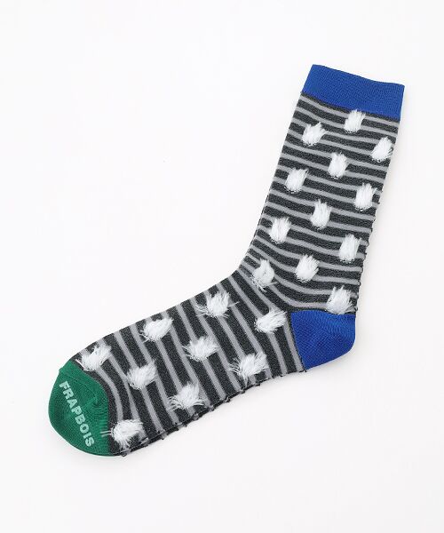 細かなボーダー柄をベースに毛足の有るドット柄を組み合わせたデザインソックス。