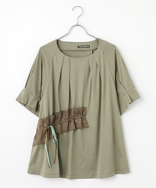 【素材】肌触りが良くしなやかで上品な雰囲気のカットソー生地と程よい光沢感が特徴のサテン生地を組み合わせたデザインカットソー。【デザイン】衿元をタックで取り立体的な膨らみを出しながらもスッキリとした印象のカットソーはややワイド目のシルエットで程よいヌケ感がポイントになっています。部分的にサテンの別布のリボンで絞った様なデザインは大胆ながら上品な雰囲気を出し、配色のテープが程よいアクセントをつくっています。【ブランド情報】FRAPBOIS/フラボア2001年にブランドスタート。「大人げない大人の服」をコンセプトに、大人が着るリラックスしたデイリーウェアを提案するコレクションブランド。レディースとメンズのアイテムをご用意しています。FRAPBOIS official website