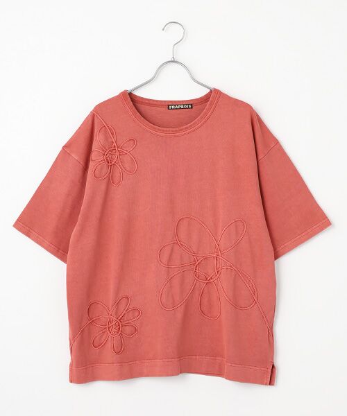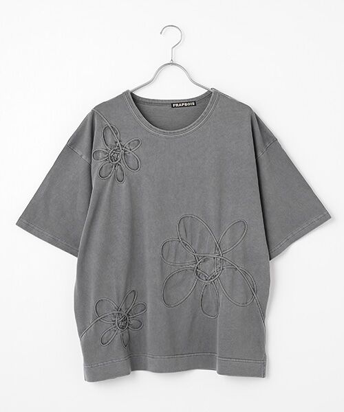 ややワイドシルエットのTシャツをベースに身頃に大胆に「マトリカリア」の花をイメージしたコード刺繍を入れ込んだTシャツを特殊な方法で染め、その後にバイオ加工で着古した風合いに仕上げています。