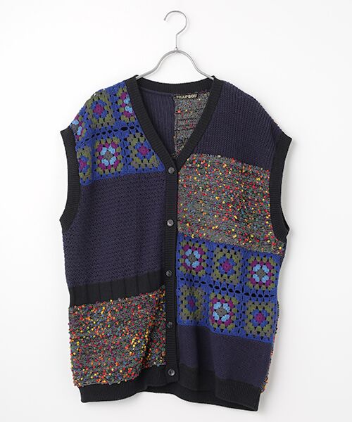 ややワイドなシルエットのパッチワーク風のデザインベストは、立体感の可愛いクロッシェやカラーネップがインパクトをつくっています。