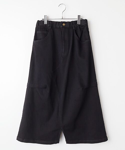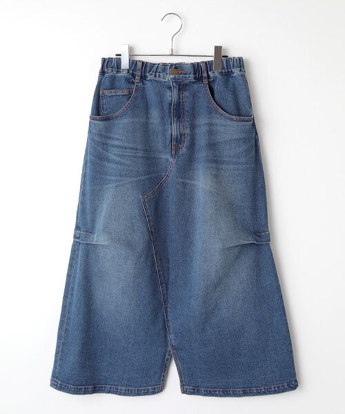 デニムパンツを解体してリメイクしたかのようなユニークな切り替えが目を引くデニムスカート。