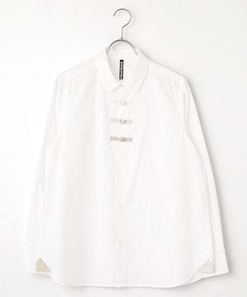 【素材】キレイな表面感とサラッとした肌触り、綿特有の肌触りの良さが特徴のブロード生地を使ったシャツブラウス。【デザイン】フロントに大胆にチャイナボタンのモチーフを入れたシャツカラーのブラウス。絶妙な配色やさり気ないポイントがインナーはもちろん1枚でもさまになるアイテムになっています。*こちらの商品はユニセックス商品です。【ブランド情報】FRAPBOIS/フラボア2001年にブランドスタート。「大人げない大人の服」をコンセプトに、大人が着るリラックスしたデイリーウェアを提案するコレクションブランド。レディースとメンズのアイテムをご用意しています。FRAPBOIS official website