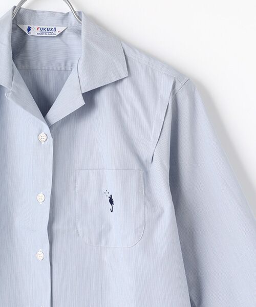 一見薄いブルーのシャツですが近くで見ると薄いブルーと白の極細ストライプに見える表情のある生地を使用しています。お洗濯をしてもシワが入りにくいのも嬉しいポイント。秋冬はシャツの上にセーター等を重ねて着用し、春夏は1枚で着用し袖を捲れば五分袖としても使えます。フクゾー定番の七分袖シリーズです。