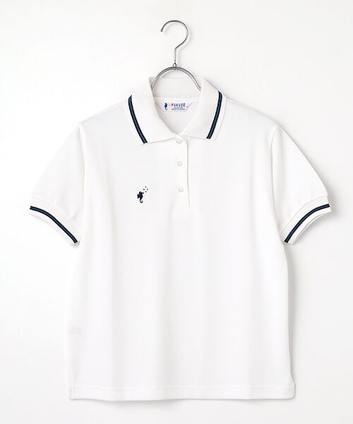 襟と袖の部分にラインが入った鹿の子生地のポロシャツです。生地の表面に凸凹があり、通気性が良いのが特徴です。洗濯機使用可。(乾燥機使用不可)