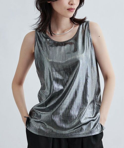 箔プリントリブ素材を用いたタンクトップは、光の加減で輝きを放つ独特な表情が魅力的。