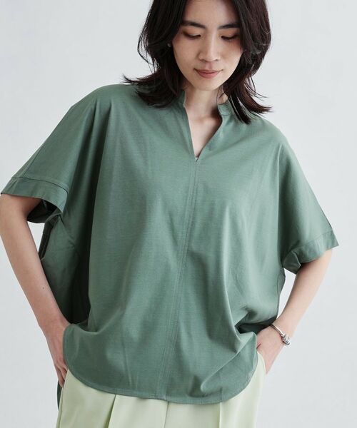 衿ぐりはバンドカラーのスリット開きで着脱しやすく、後ろにはギャザーディテールを入れヒップを包み込むデザインです。