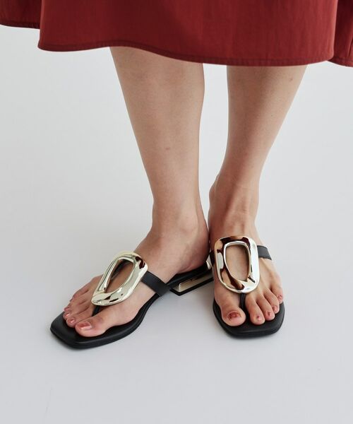 ゴールドカラーのメタリックトリムが映えるブラックレザーサンダル。