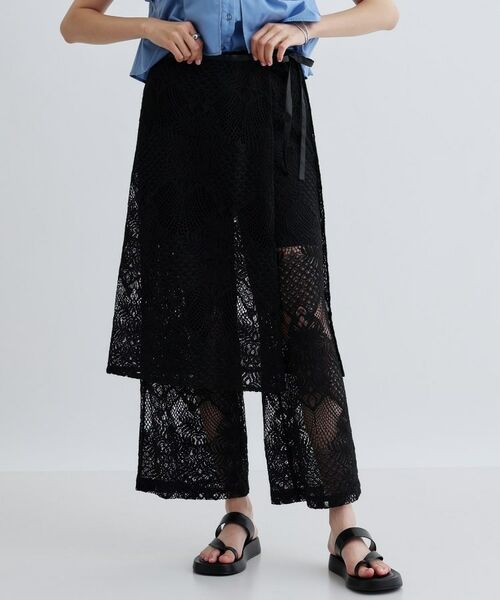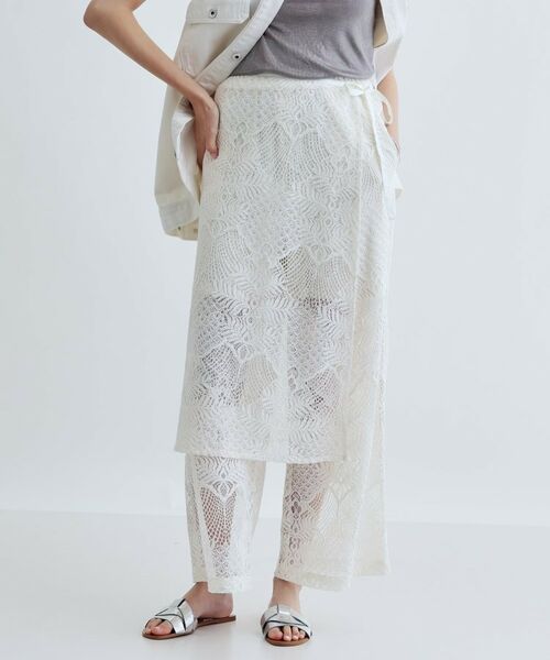 ボトムレイヤードで今年らしいスタイリングが楽しめる、ラップスカートSETのレースパンツ。
