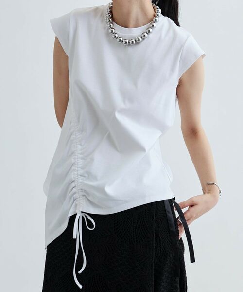 独自のギャザー使いがキュートで、サイドのシャーリングが優雅なシルエットを生み出します。