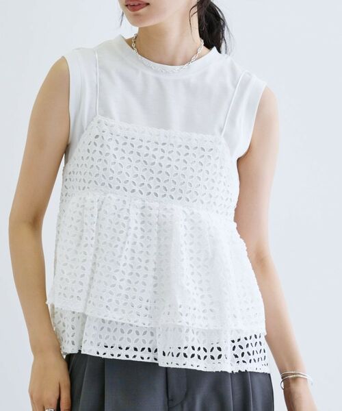 レイヤードスタイルが際立つカットソーは、レースキャミソールとシームレスに組み合わさるデザインが特徴。