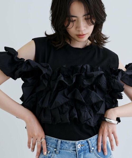 華やかなフリルが施された大胆なスリーブが、シンプルなボディと絶妙に組み合わさり、一枚でスタイルを引き立てます。