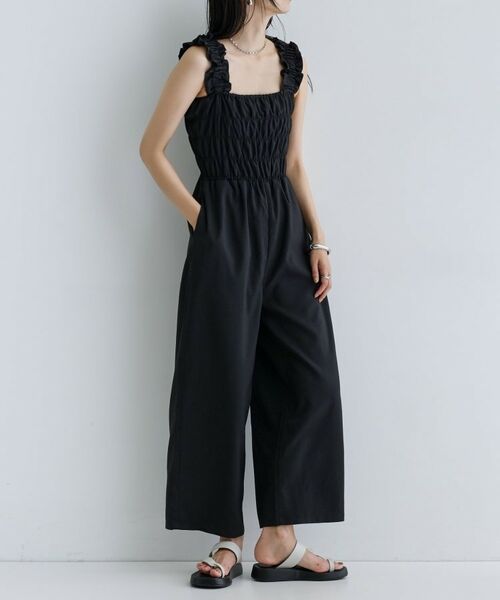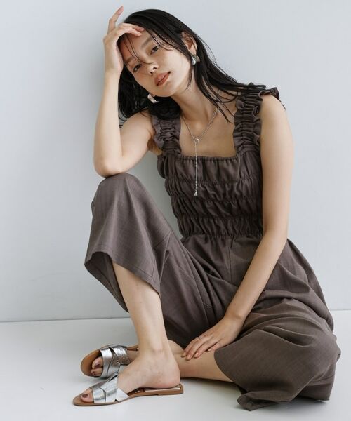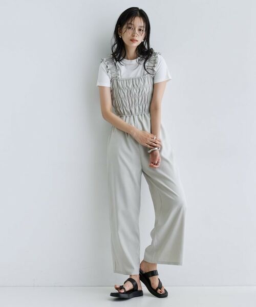 トップス部分に入れたシャーリングが目を惹くサロペットは、軽やかな印象を与えつつ、程よいフィット感で女性らしいシルエットを演出します。