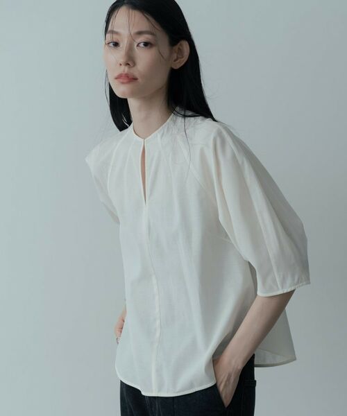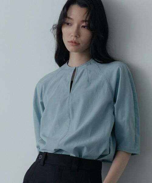 タイトな衿元と柔らかなシルエットのバランスが洗練された印象を与える一枚です。