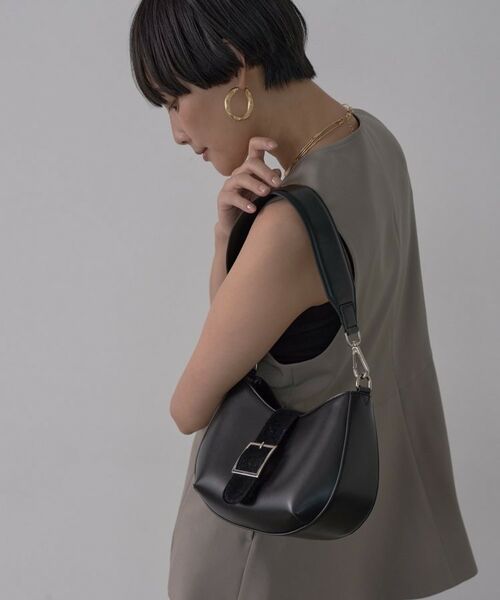 ユニークなシルエットとスタイリッシュなバックルが特徴のバッグ。
