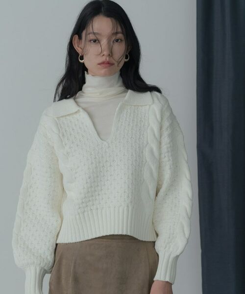 立体感のある編み地とボリュームスリーブが特徴のニット。