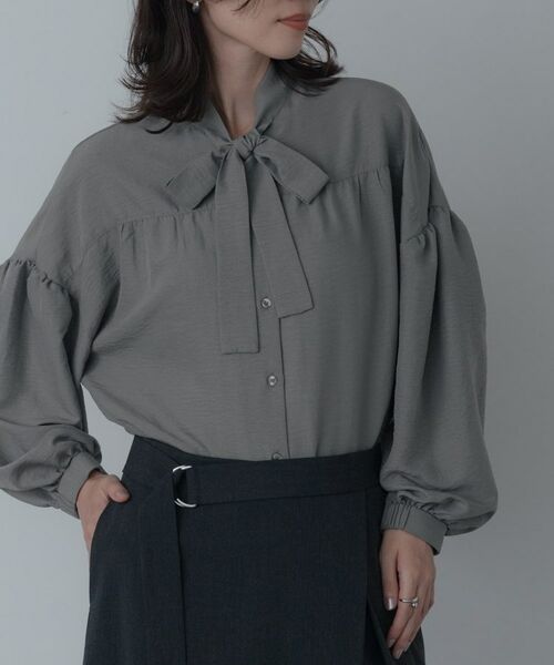 柔らかい印象を与えるボリュームスリーブに、リボン付きのネックデザインが特徴的なブラウス。