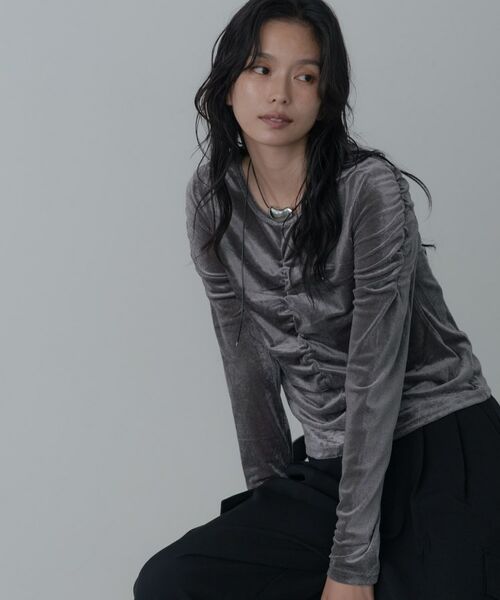 シャーリングディテールがボディラインを美しく引き立て、女性らしいシルエットを演出します。