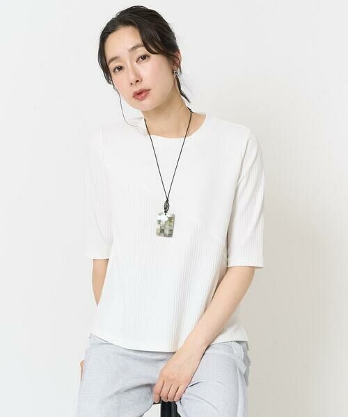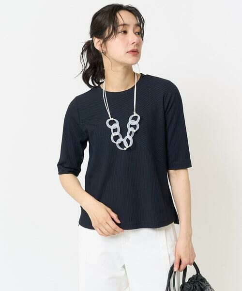 ・身頃にバイヤス切り替えを入れた5分袖のストレッチリブカットソー