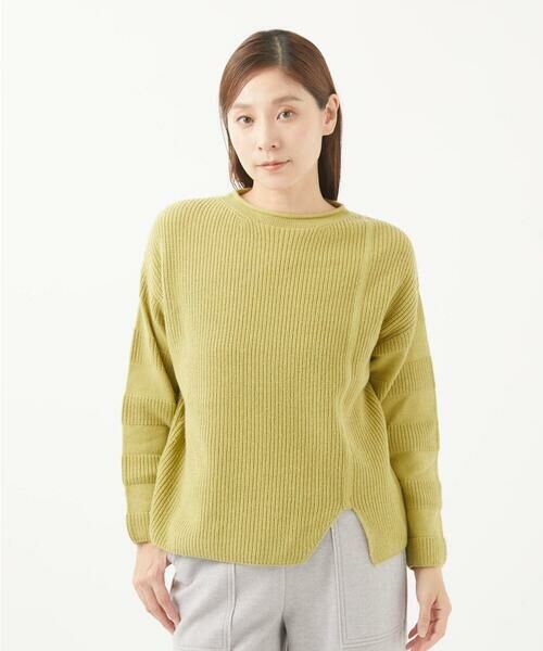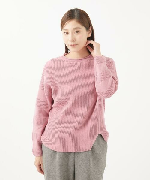 7ゲージの畦編みを活かしたシンプルなデザインに仕上げました。前身頃のスリットと袖を編地で表現したボーダーがポイント。発色のいいカラーバリエーションもポイントです。