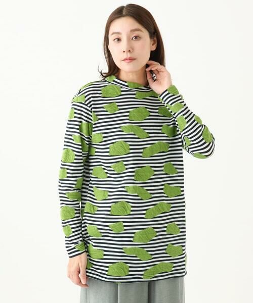 首にやさしく沿うモックネック衿デザイン。お尻まで隠れる使いやすいロング丈です。ボーダーに雲が浮かんでいるようなジャガードで表現した柄がポイントです。