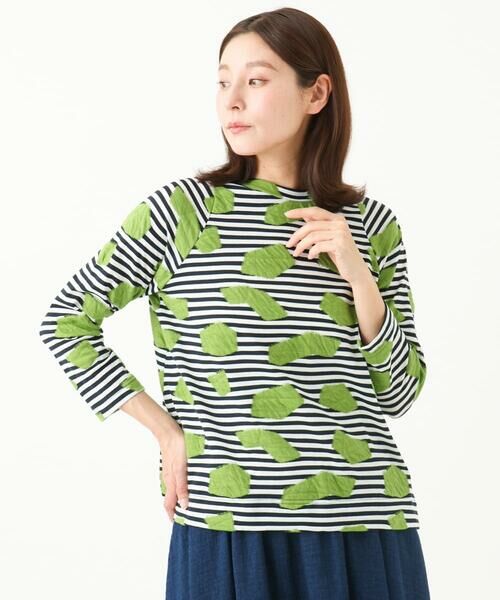 やや横広がりのシルエットに合わせて、袖つけの肩の位置を内側にして華奢見えデザインに仕上げました。短すぎず長すぎずの丈感は足長効果もあり、ボトムとのバランスをとりやすい丈感に仕上げています。ボーダーに雲が浮かんでいるようなジャガードで表現した柄もポイントです。