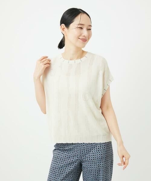 程よいシアーで、トレンド感のあるスタイリングが楽しめるニットベスト。今の時期は、ブラウスやカットソーとのレイヤードがおすすめ。合わせやすいカラーバリエーションなので、ボトムに柄物を合わせても◎。夏本番には、タンクトップやキャミソールとあわせて涼しくお楽しみいただけます。