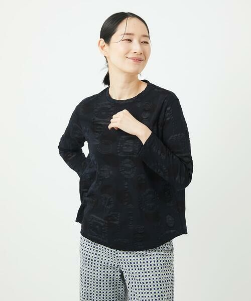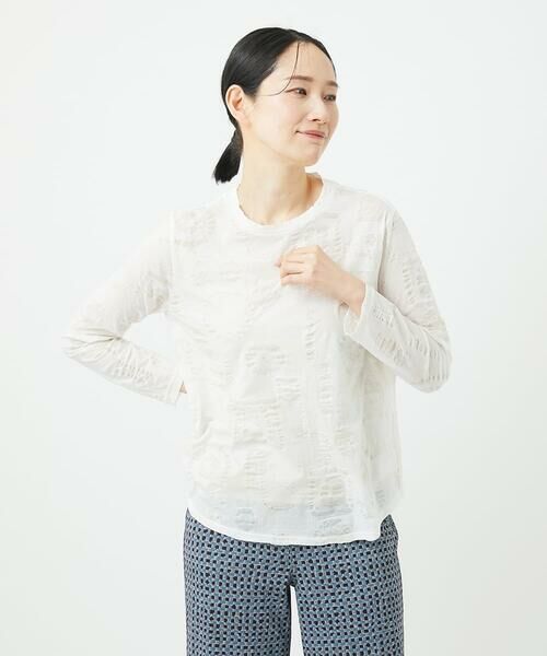 透け感のあるリップル天竺を使用したカットソーブラウスです。ドットと四角柄のモチーフ部分が透けていて、爽やかで涼し気な印象です。衿元にさりげなくギャザーを寄せているデザインがポイント。1枚着はもちろん、インナーとして重ね着にも活用できます。