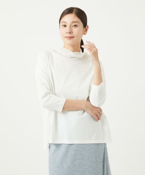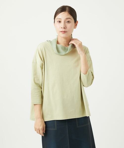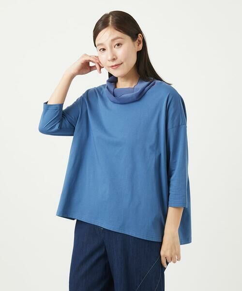 清涼感があり素材の良さからきれい目に見えるカットソーブラウスです。異素材使いの衿がポイント。布帛のような生地で程よいドレープ感が上品さを醸し出します。ドロップショルダーのゆったりとしたシルエットに、裾は程よく前後差をつけてラウンドさせ、女性らしい魅力のあるラインです。袖は6部袖でひじが隠れる安心丈です。