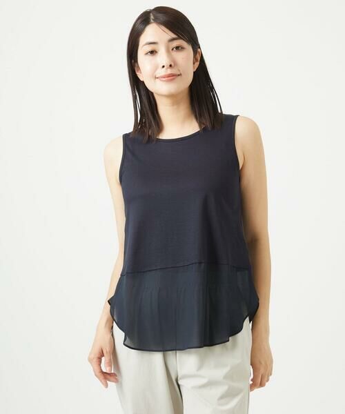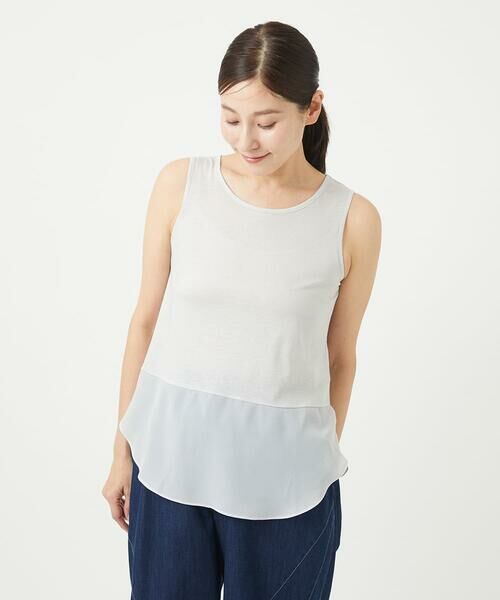 カットソーと布帛を使い合わせたデザインタンクトップです。プルオーバーと重ね着した時に表に出ない様に少し大きめの衿開きにしています。肩の部分も幅を広めにしているので方から見えないようデザインしています。シアーな布帛素材のラウンドヘムデザインの裾は、レイヤードした時にすっきりとキレイ見えするデザインに仕上げました。