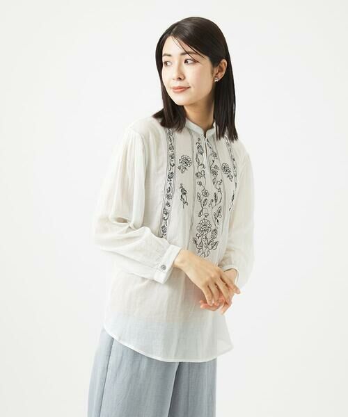 前身頃の前立てにフラワーとリーフ柄、両脇にはリボンを垂らしているような、細いラインで描かれた繊細な刺繍で、インド製らしいアンティークな雰囲気に仕上げました。衿と袖口、背中にも刺繍と同じカラーでアクセントを付けています。袖山と後身頃には細かいタック、袖口にもギャザーを入れて甘さを加えたデザインに仕上げました。襟元は、スタンドカラーにすることで上品に仕上げました。