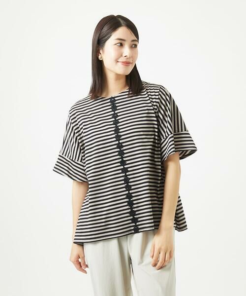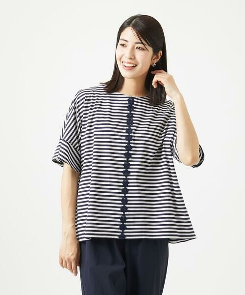大人な配色がポイントのボーダーカットソー。前身頃の中心にはボーダー柄に合わせたコードと柄を選んだレース使いがデザインポイントです。大きくとったシルエットに地の目を変えた袖のデザインは、カジュアルになりがちなボーダーをエレガントな雰囲気に仕上げました。袖をゆったりめにして、程よい丈感にすることで涼しく、腕が華奢見えするデザインに仕上げています。