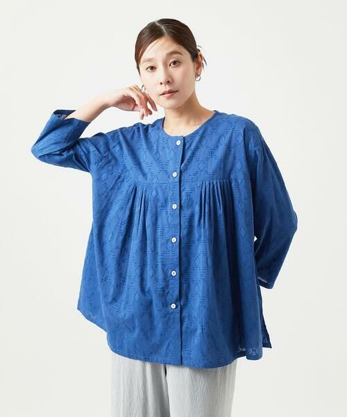 オリジナルのダイヤ柄カットジャガードをコットン素材に表現したブラウスです。衿は丸首ですっきりとしながら、ハイウエストで切り替えてギャザーをたっぷりいれてることで、ふんわりとしたシルエットとスタイルアップデザインに仕上げました。裾にはスリットを入れて動きやすく、抜け感のあるデザイン。程よい7分袖丈で前開きデザインなので、羽織りとしても使いやすいデザインです。