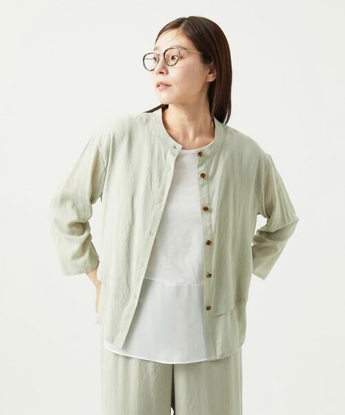 衿は小さめのスタントガラーに仕上げ、前を閉めても開けても決まるブラウス。風になびく涼やかな素材感で夏に最適なアイテムです。前身頃はティアード風の2枚重ねで仕上げ、後身頃はヨーク切り替え部分からアシンメトリーに切り替えていて、着用すると生地の動きを感じられるカッティングが特徴です。